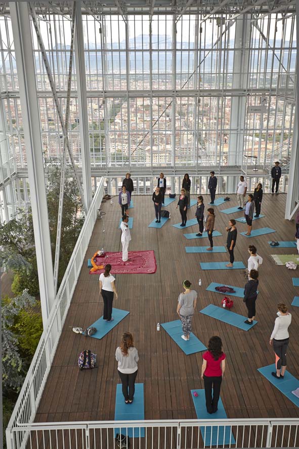 The building designed by Renzo Piano imagined the « ice fragment »at the foot of the Alps, is considered among the most environmentally sustainable in the world. The summit, reachable in 30 seconds by lift, houses a bioclimatic greenhouse with tall trees, open to the public, like several of the creative areas distributed over 38 floors.